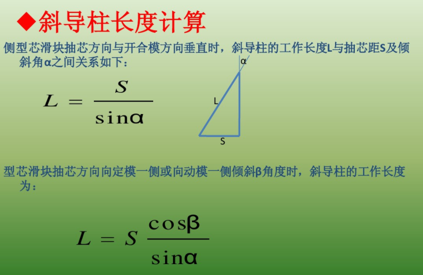 導柱C段的長度,相當重要,它的長短控制著滑塊跑動的距離S。斜導柱的長度計算其實就是利用“三角函數”來計算。我們可以簡化成一個三角形,方便使用“三角函數”式計算。設定S就是圖中的滑塊滑動距離S,角度X就是圖中的角度D。(這兩個數已經根據產品、模具設計的需要設定為固定值,是已知數。)長度L相對于上圖中的C。高度H,就是滑塊滑動到了指定位置時,模具打開的距離。這樣計算出來的數值只是在理想化的狀態下,實際上還要考慮到滑塊和斜導柱之間的間隙,以及它們上面的圓角,等等因素。不過,現在AutoCAD等電腦輔助設計軟件已經是如此先進,完全把人們從繁雜的計算公式中解放出來,只要通過一些簡單的命令,或者利用一些更快捷的外掛,就能畫出所需要的斜導柱,也從而可以得出其長度,還可以模擬它們在開模后的狀態。